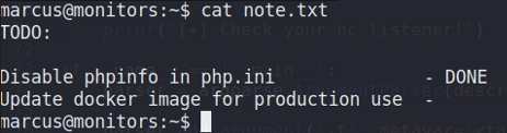 In the user's directory, we find a note.txt file that points towards a docker image being present.