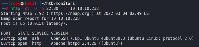 I used ssh -L 8443:localhost:8443 marcus@monitors.htb to port forward after dropping my public key in the authorized_keys folder. Then, I used gobuster to find hidden directories present: