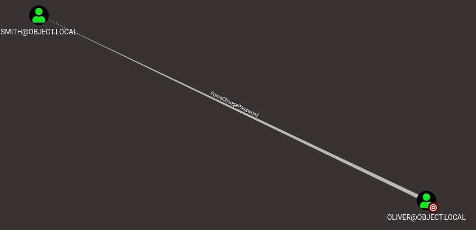 We find that within Bloodhound, the oliver user has the ForceChangePassword permission over the smith user.