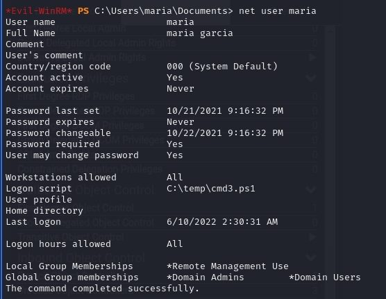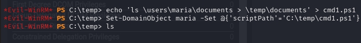 As smith, we can create a malicious Powershell script and change the logon script for maria.