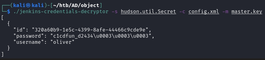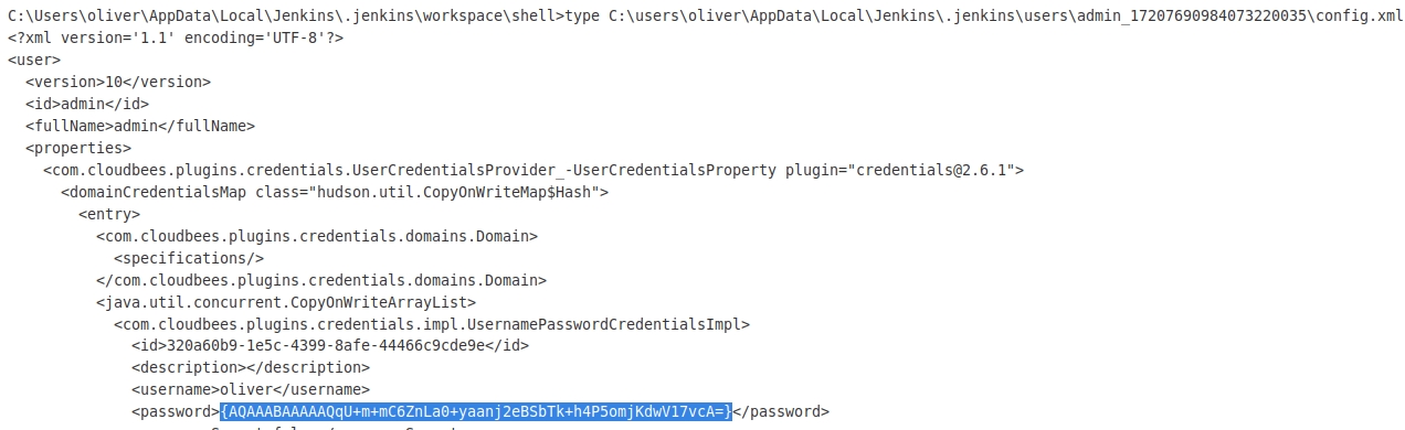 With Jenkins instances, we would need to extract 2 files that are used to decrypt this password, which is the master.key and the hudson.util.Secret files. These can be found within the C:\users\oliver\AppData\Local\Jenkins\.jenkins\secrets\ folder.