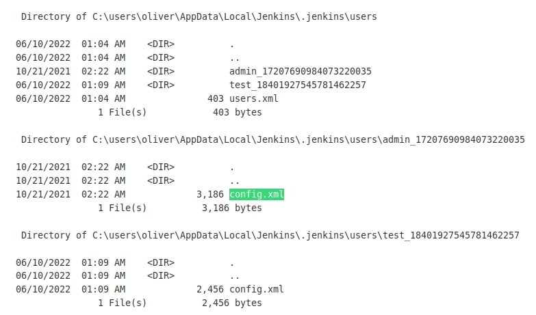 We find another .jenkins folder. Within that, we would find another users folder with some config.xml files: