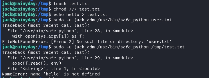 There's an exec( ) function being called, which is always interesting. This binary seems to execute python code within a set environment or something. My guess is that we need to create a python script that would execute to get us a shell as jack_adm.