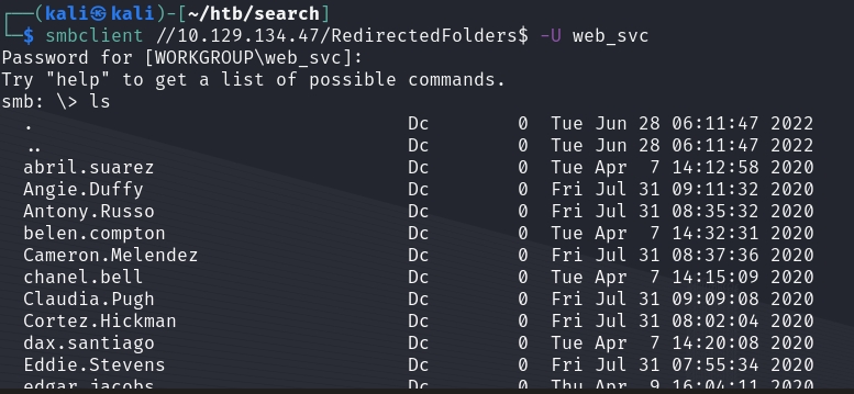 I still don't have access to the helpdesk share, so I looked at the rest. Within the RedirectedFolders$ share, I found a ton of usernames.