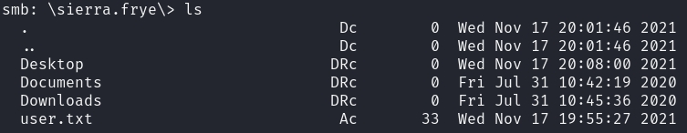 Using the RedirectedFolder$ share, we can sign in as the sierra.frye user and retrieve theuser flag.