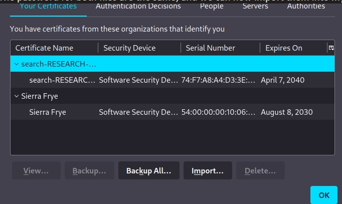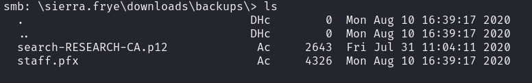 We can login as sierra.frye usingthe credentials we found earlier. For Computer Name, I guessed search and research based on the certificates I found, and research worked.