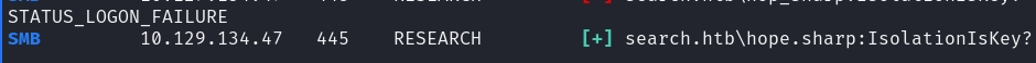 This tells me that there was an interesting password to find. As such, I created a bunch of possible usernames with the name Hope Sharp, and used crackmapexec to brute force these credentials. Found that hope.sharp was the username: