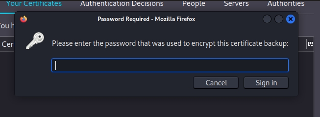 Because these are certificates, perhaps they can be loaded into our browser for viewing of hidden websites. However, they are password protected.