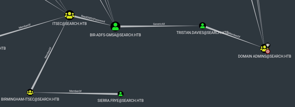 Looking back to Bloodhound, I found that this user was able to ReadGMSAPassword for the bir-adfs-gmsa user, in which the latter had GenericAll privileges over the domain admin tristan.davies.