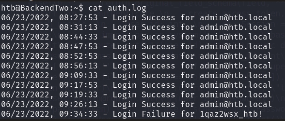 Once we are in, we can try to read the auth.log file and we would find the password for the htb user we currently are. This allows us to upgrade our shell via SSH-ing in.