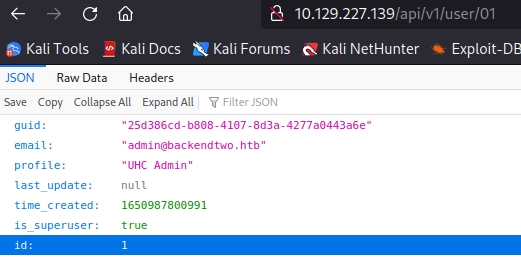 Port 80 brings us to an API again, with the admin user still being viewable.