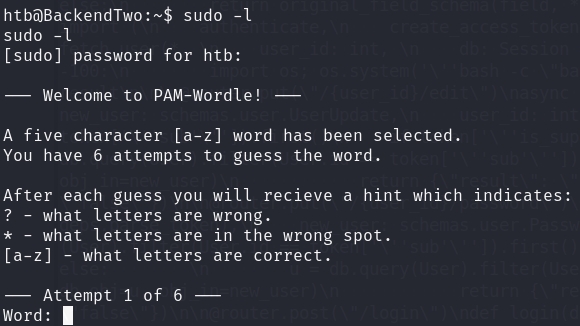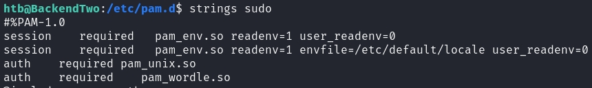 We can then use find / -name pam_wordle.so 2> /dev/null to find this library and run strings on it. It would be located in the /usr/lib/x86_64-linus-gnu/security directory and is readable by all. We can then use strings on it.