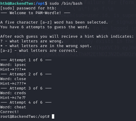 From the output, we find that the wordlist for wordle is from /opt/.words, which would allow us to scope our guesses.