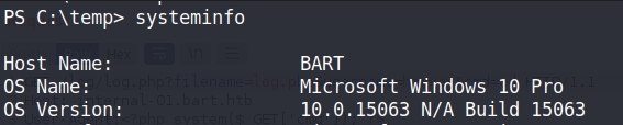 Checking systeminfo, we also find that a vulnerable version of Windows was running with no hotfixes.