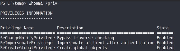 When checking our privileges, we notice we have the SeImpersonatePrivilege enabled.