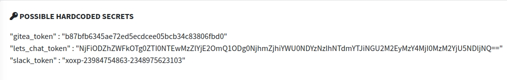 We can upload the APK file we downloaded and let it analyse it for us. What's great about this is that it also checks for secrets and passwords alike. At the bottom of the page, we would see these tokens: