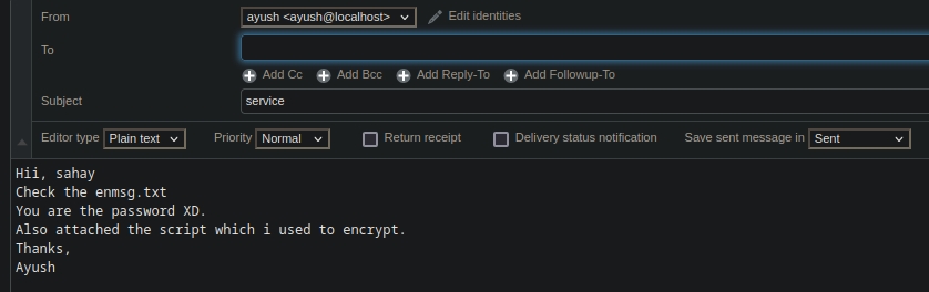 YDo!The message says that You are the password XD, meaning that sahay is the AES key used. The encryption sc ript writes the file size as the first 16 bytes, and then the next 16 bytes is the IV used. The key used is the SHA256 hash of sahay.