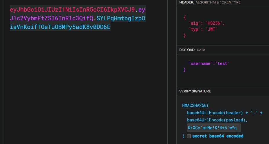 Cookie: auth=eyJhbGciOiJIUzI1NiIsInR5cCI6IkpXVCJ9.eyJ1c2VybmFtZSI6InRlc3QifQ.SYLPqHmtbgIzpOiaVnKoifTOeTuOBMPy5adK8v0DD6E