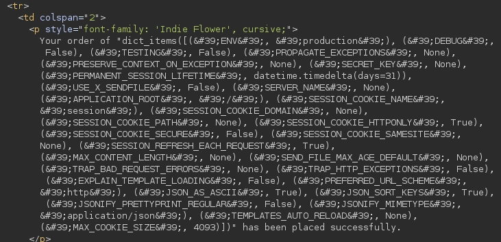 return redirect('/',code=302)It seems that this uses render_template to process the order that has been placed. This function is vulnerable to SSTI. We can view the post request in Burpsuite: