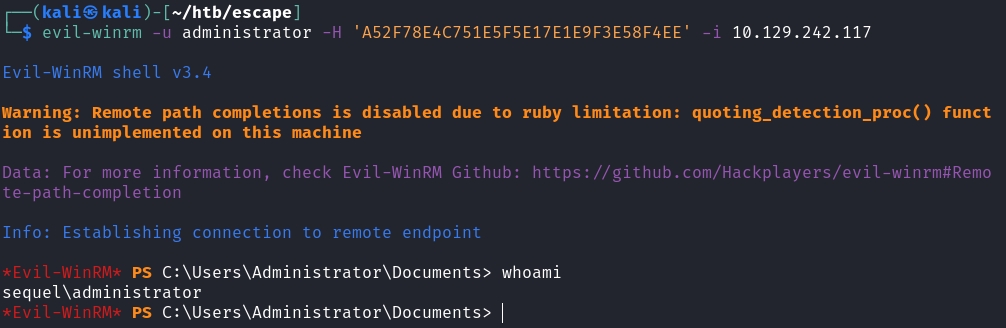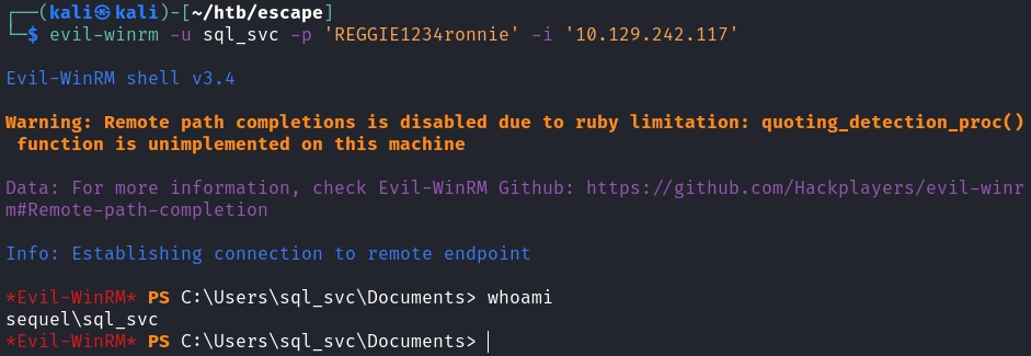 REGGIE1234ronnie (sql_svc)With these credentials, I was able to login via evil-winrm.
