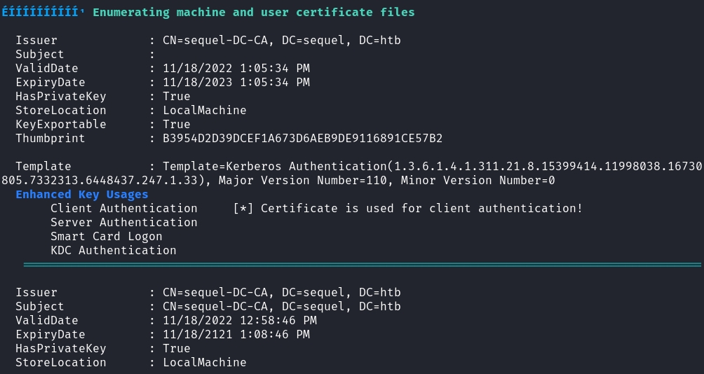 I ran a winPEAS scan to enumerate for me. This scan found some certificates on the machine that could potentially be the PE vector.