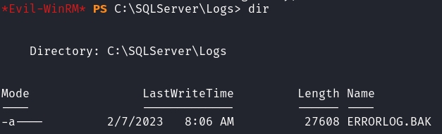 Within the C:\SQLServer\Logs file, we can find an ERRORLOG file: