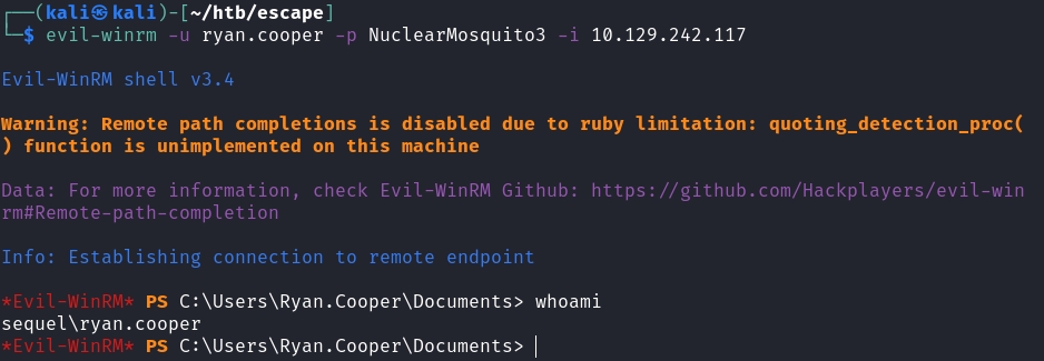 2022-11-18 13:43:07.48 Logon Logon failed for user 'NuclearMosquito3'. Reason: Password did not match that for the login provided. [CLIENT: 127.0.0.1]With these credentials, we can login as ryan.cooper.