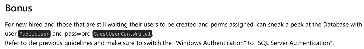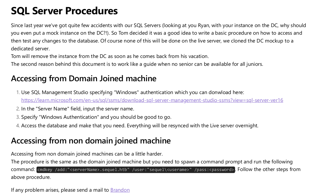 The next page contains a guest login for the SQL server. We also find a user called brandon.brown, who is likely some kind of database administrator.