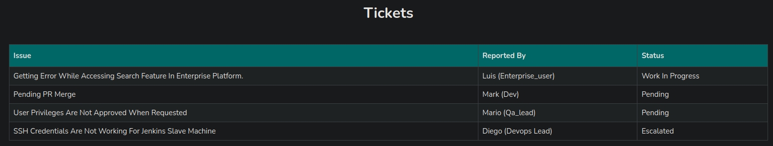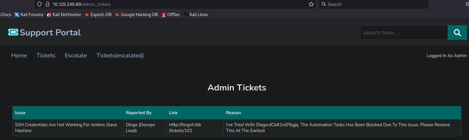 Looking at the tickets portion, I can see that there are some SSH credentials for a Jenkins machine on the backend. The tickets are sent to the administrator, which I think is a separate user.