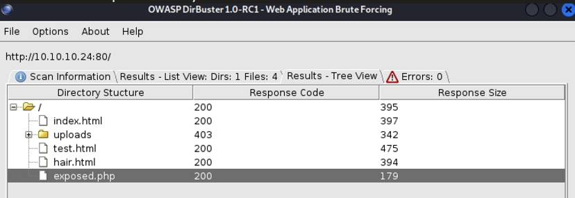 I ran a directory scan and found an exposed.php endpoint. We also find an /uploads directory that could potentially be used.
