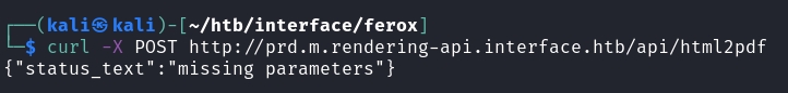 $ ffuf -u http://prd.m.rendering-api.interface.htb/api/FUZZ -X POST -w /usr/share/seclists/Discovery/Web-Content/raft-medium-directories-lowercase.txt -mc all -fs 50