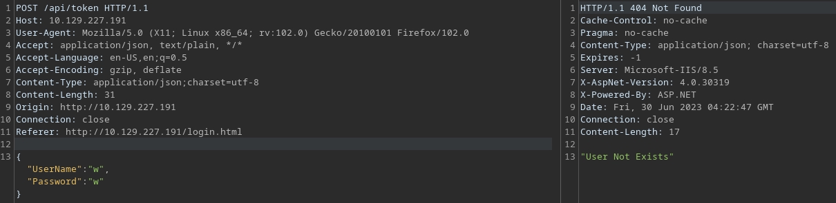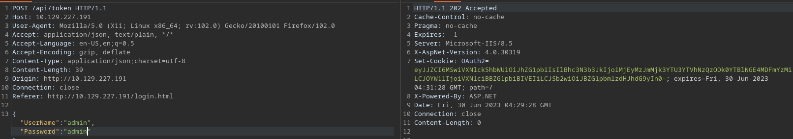 }]);This bit of code reveals a bit more about how the POST requests to /api/token are processed. We can try to send a POST request with admin:admin as the fields. This returns a request with the OAuth2 cookie set to a JWT looking token:
