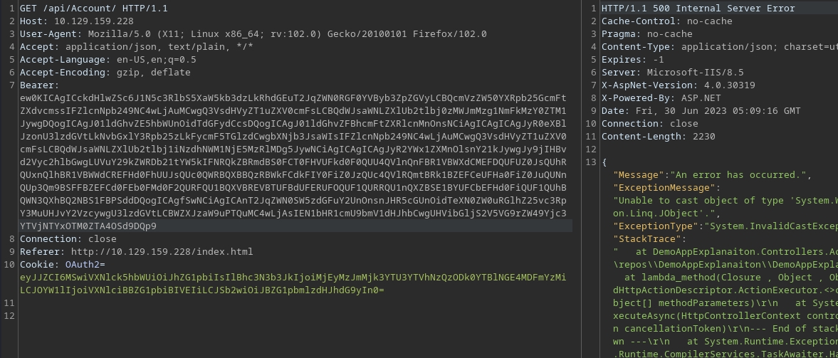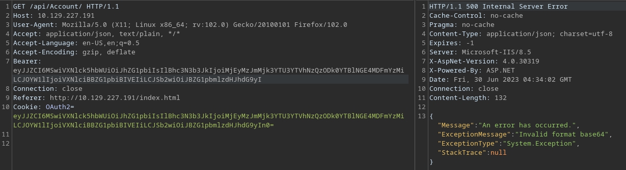 The response was the same as the decoded cookie value! This means that either the OAuth2 cookie or the Bearer HTTP header value was being deserialised and decoded via base64 or something. If we remove a few characters from the Bearer header, we get an error: