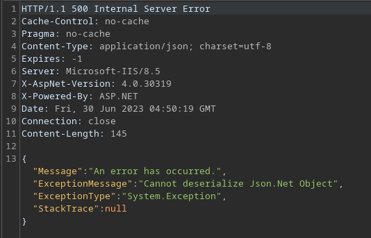 There definitely is an insecure deserialisation exploit here, because the values of the Bearer header are likely unsanitised since it still attempts to process it. As such, we can use ysoserial.exe to generate a payload to give us a reverse shell.