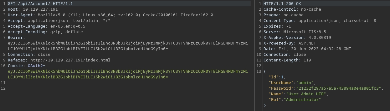 $ echo eyJJZCI6MSwiVXNlck5hbWUiOiJhZG1pbiIsIlBhc3N3b3JkIjoiMjEyMzJmMjk3YTU3YTVhNzQzODk0YTBlNGE4MDFmYzMiLCJOYW1lIjoiVXNlciBBZG1pbiBIVEIiLCJSb2wiOiJBZG1pbmlzdHJhdG9yIn0= | base64 -d | jq